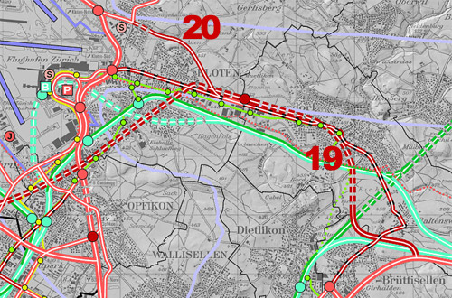 | 19 | Glattalautobahn, Zusammenschluss A53, A1, A51, A20 | Hochleistungsstrasse (Nationalstrasse) | Neubau von 4-streifiger Autobahn mit Tunneln (in Koordination mit Pt. 3.9.2 Nr. 27); Machbarkeit Anschlüsse Dietlikon, Kloten-Ost, Flughafen-Werft und Vollanschluss Opfikon sowie Ausbaustandard zwischen Flughafen-Werft und Seebach in Prüfung; Abklassierungen in Wangen-Brüttisellen, Bassersdorf und Kloten, Begleitmassnahmen; Linienführung in Prüfung |