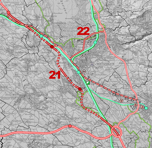 | 22 | Westtangente Wetzikon | Hauptverkehrsstrasse | Neubau von 2-streifiger Strasse als flankierende Massnahme zur Oberlandautobahn (Nr. 27), Begleitmassnahmen | kurzfristig |
