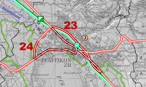 | 23 | Ortsdurchfahrt Pfäffikon | Hauptverkehrsstrasse | Neubau von 2-streifiger Strasse, abzustimmen mit Grundwasserschutz, Abklassierung, Begleitmassnahmen | langfristig (Trasseesicherung) |