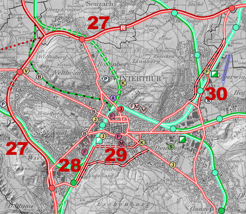| 29 | Heiligbergtunnel Winterthur | Hauptverkehrsstrasse | Neubau von mehrstreifigem Tunnel im Anschluss an tiefergelegte Untere Vogelsangstrasse (Nr. 34), Abklassierung Breitestrasse, Begleitmassnahmen | mittelfristig |